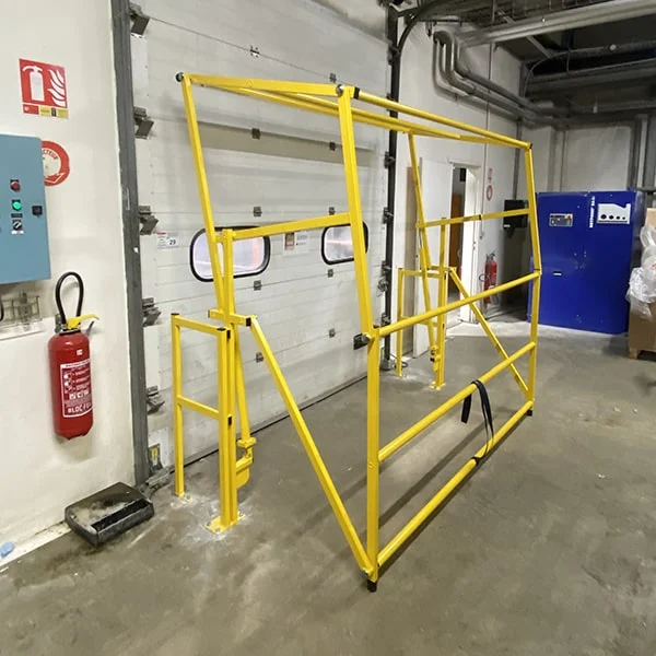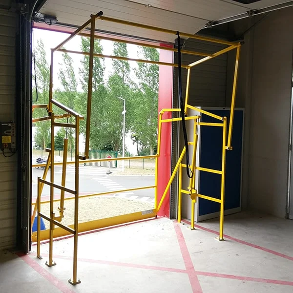 La barrière écluse de sécurité Type X Triax Sécurité est spécialement conçue pour les abords de portes industrielles (coupe-feu, sectionnelles ou coulissantes). Elle compense l’écart entre le bord de vide et l’arrière de la porte, garantissant la sécurité des opérateurs tout en facilitant la manutention des palettes par chariot élévateur. Sa conception sur mesure lui permet de s’intégrer parfaitement aux environnements industriels les plus exigeants.